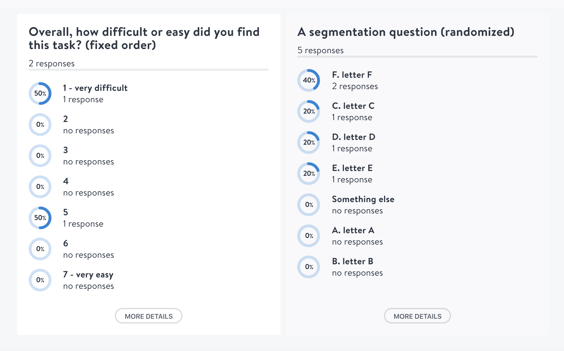 You can check the randomization of answer options by previewing your survey. You will not see the effect of the randomization when editing your survey, but the randomization option will help you with the presentation of results. If randomization isn't selected for a particular question, the results will be presented in the same order as in the survey design. If randomization is selected, results will be ordered based on the number of votes per answer option, from high to low. See the illustration below for an example of both variants.